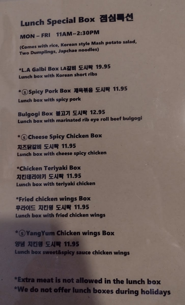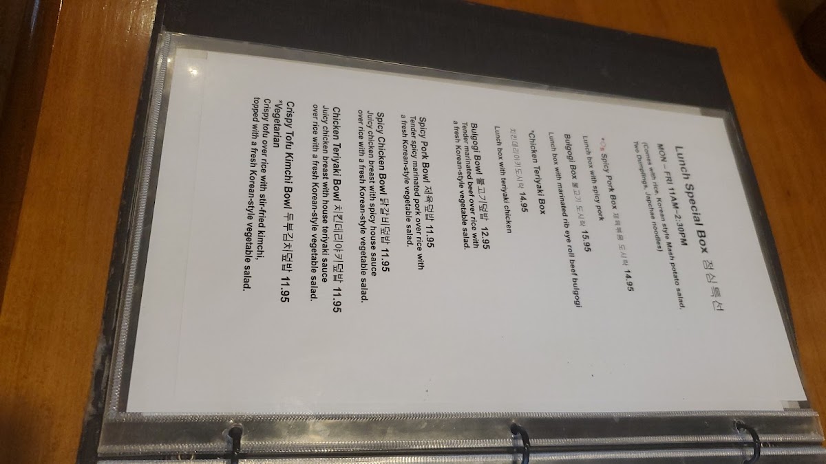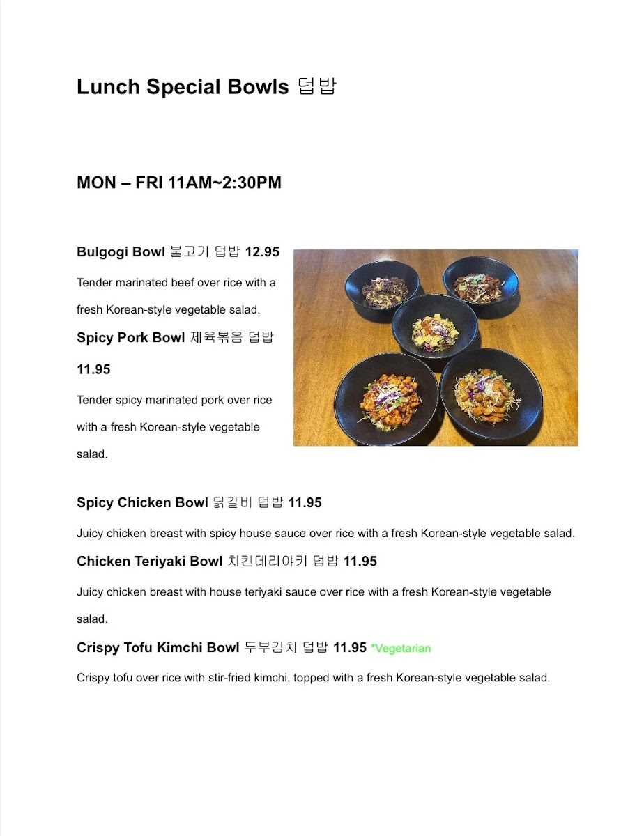 For something a tad more filling, the Spicy Chicken Bowl (닭갈비) is a customer favorite at $11.95. It features spicy chicken paired with sweet potato noodles, cabbage slaw, and a side of chili aioli, creating an explosion of flavors that keep you coming back for more. And for those who indulge in rice bowls, the Chicken Teriyaki Bowl is equally delightful, ensuring a satisfying experience for diners craving something hearty and delicious.